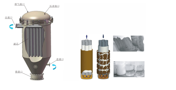 3、过滤状态:液体透过滤布,从外部多孔管中流向中心管,再流向集液管。滤布受压贴附于支撑管外表面,凹凸的支撑管能够增大过滤面积并帮助固定滤饼,防止滤饼脱落,从而稳定过滤效果。